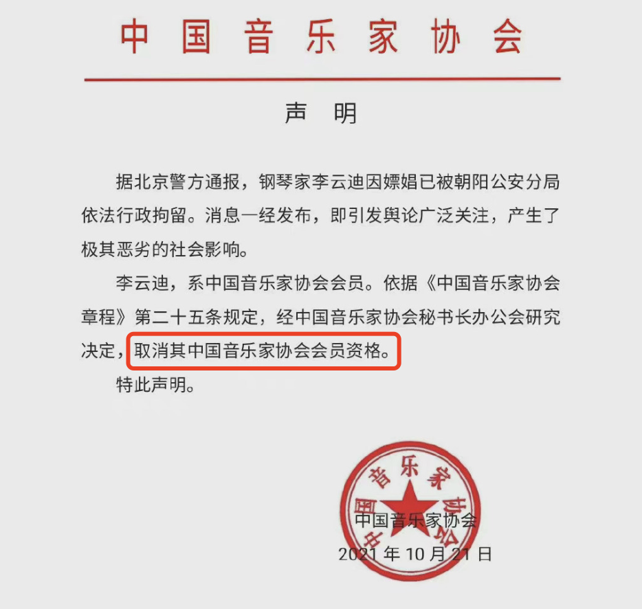 紧接着中国音乐家协会秘书长办公会研究决定,也取消其中国音乐家协会会员资格。