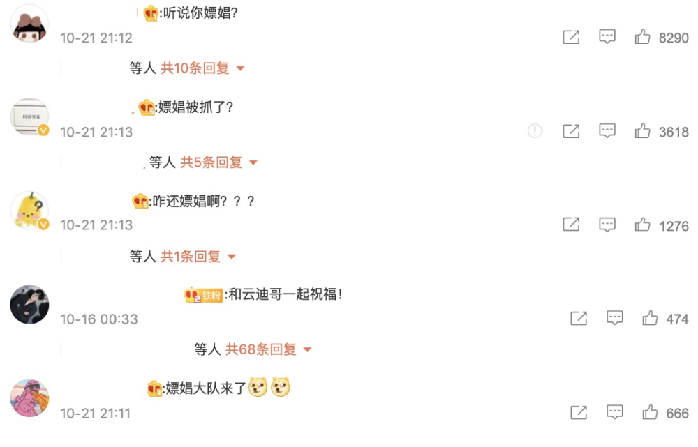 但是最近的几条动态还是被“嫖娼”批评言论所沦陷。