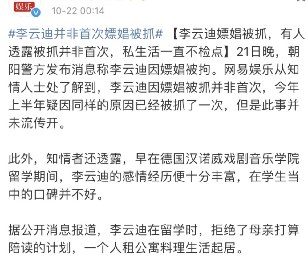 此外,根据知情人透露,李云迪嫖娼被抓这已经不是第一次,今年上半年疑因同样的原因被抓了一次,只是当时事情没有被传开。早年在德国汉诺威戏剧音乐学院留学期间,感情经历就十分丰富,在学生中的口碑并不好。