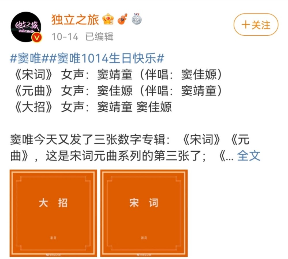 前段时间,音乐人窦唯与音乐学院的讲师文智涌所组成的朝简乐队在窦唯生日当天,共同推出了几张全新的数字专辑《宋词》、《元曲》以及《大招》。