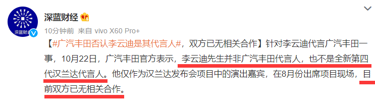 10月22日,广汽丰田率先发声,发布声明撇清与李云迪之间的关联,就官方信息公布,李云迪目前并非广汽丰田的代言人,也不是其第四代新品的代言人,此前品牌方仅仅邀请李云迪以演出嘉宾的身份出席新品发布会,实际上双方并无实质性的合作关系。