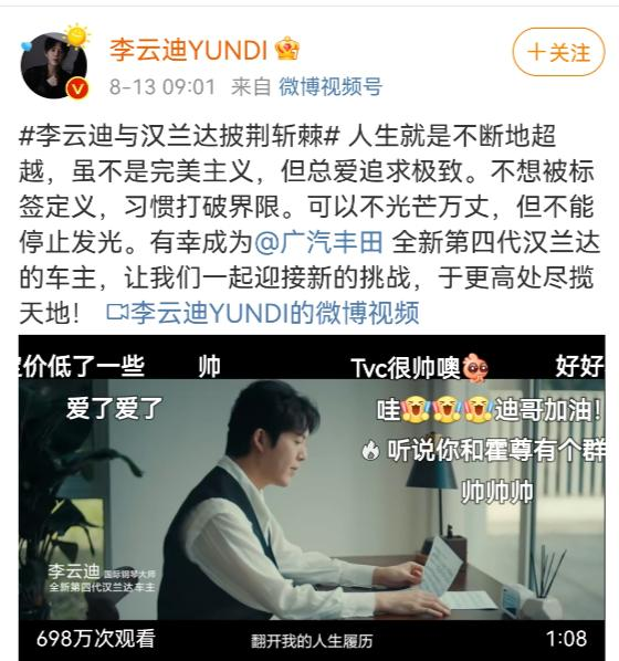 8月份,李云迪再度亮相广汽丰田的系列发布会,当时官方曾认证李云迪是旗下汽车品牌汉兰达的代言人。