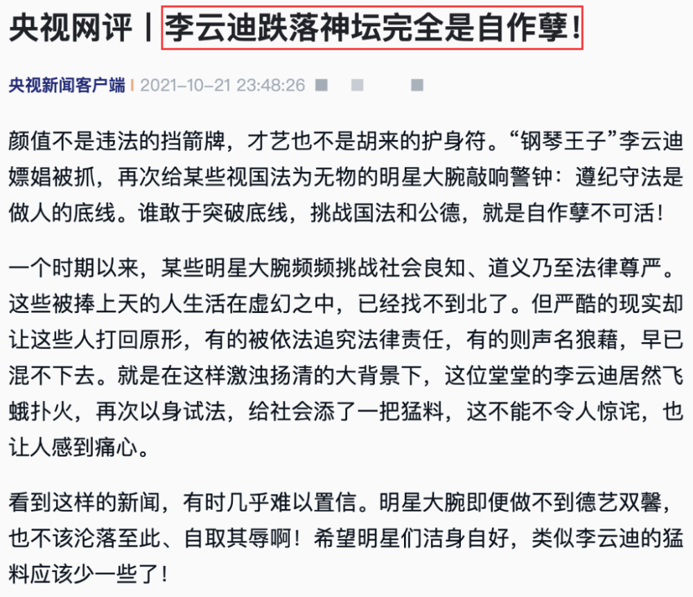 而央视的点评与其说是针对李云迪翻车,不如说是针对娱乐圈的部分艺人,李云迪更像是为其他艺人做了反面教材。