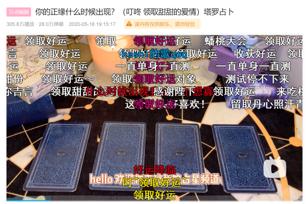 看问答测试、塔罗牌占卜类的互动视频,观众更多出于对测试结果的好奇,是一种对自我的探索。这种视频也更容易实现跨平台的人际传播——参与者可能在其他社交媒体平台分享测试结果,同时也分享了视频。