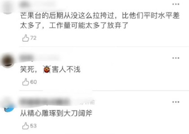 网友们评价芒果台的后期,从精雕细琢到大刀阔斧,对比效果十分明显。芒果台后期一直都有不错的口碑,有趣又精致,从未如此拉胯,这次算是彻底放弃了。