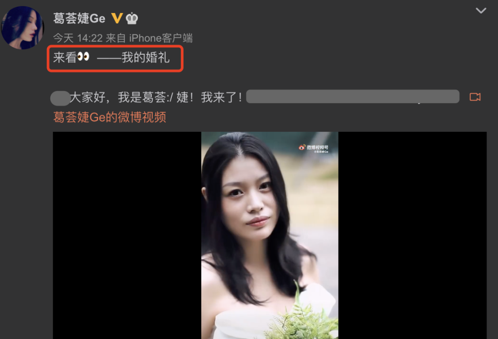 10月22日,汪峰的前女友,也就是孩子小苹果的生母葛荟婕在社交平台上分享了一段自己穿着婚纱的视频,并附文以“来看我的婚礼”。
