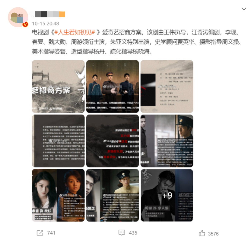 10月15日,电视剧《人生若只如初见》公布了平台的招商方案,一般影视剧到了招商阶段,也说明电视剧距离上线不远了。而《人生若只如初见》从演员阵容到剧情内容,都是爆款之相,所以招商注定会非常顺利。