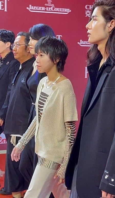 照片中的她发型是特有的非主流,穿着一身的黑西装,再搭配一双白色皮鞋。一身行头看起来非常的拉胯。而且她本身就很瘦小,再加上穿这一身松松垮垮的衣服,看起来就更加邋遢,一点女明星气质也没有,和当年的王菲简直是无法比拟的。