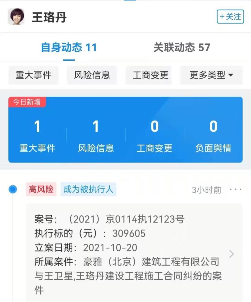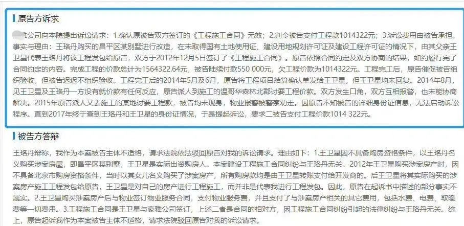 2019年11月18日,北京市昌平区人民法院裁判,豪雅建筑工程有限公司与王卫星于2012年12月5日签订的《工程施工合同》无效,并要求王珞丹、王卫星于本判决生效后十日内连带支付豪雅建筑工程有限公司工程款30.96万元等。