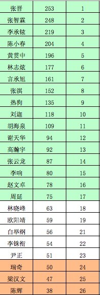 而目前的前十七名分别是张晋、张智霖、李承铉、陈小春、黄贯中、林志炫、言承旭、张淇、热狗、刘迦、胡海泉、谢天华、高瀚宇、张云龙、李响、赵文卓、周延。