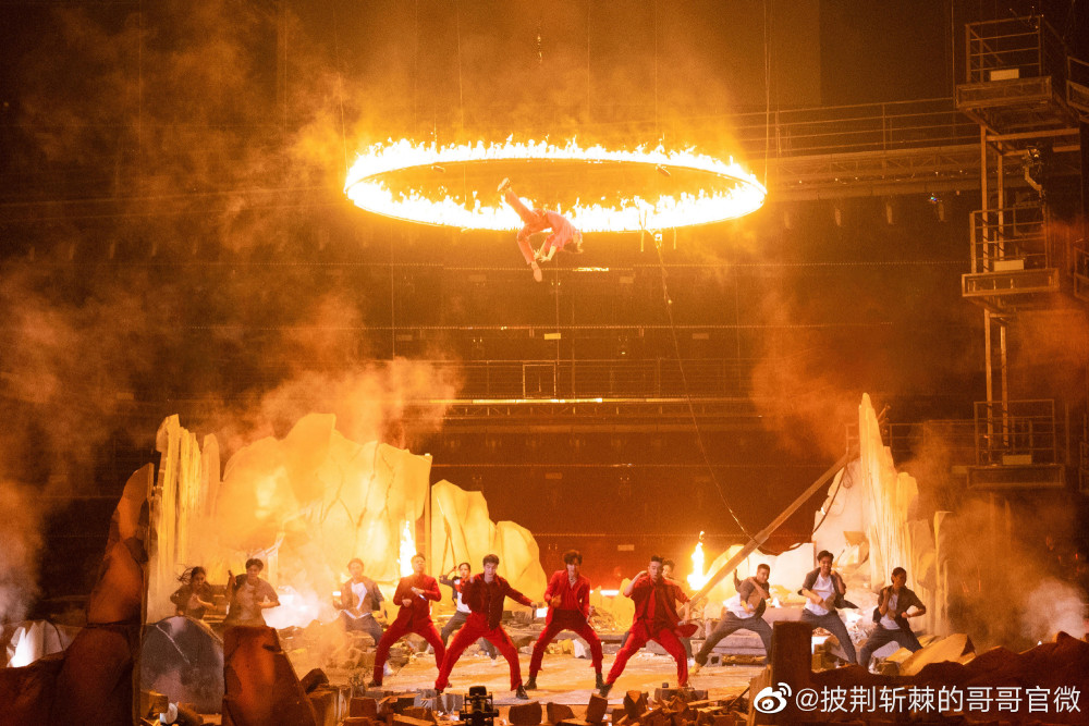 在这个舞台上,李响绝对是王炸,他吊威亚飞升到火圈中间舞蹈,瞬间把现场推向了一个新的高潮。