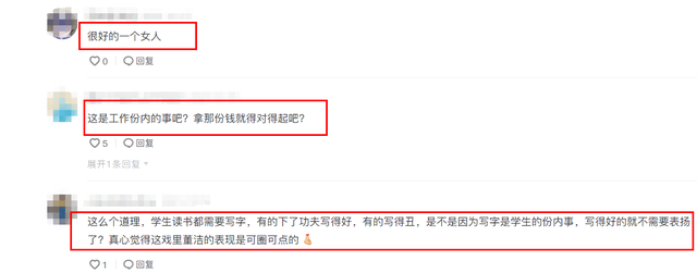 对此,网友们也却各自有着自己的看法。有网友认为虽然董洁在雨夜中拍戏,但这是其工作分内的事情,拿了这个钱就要对得起大家。而另一些网友认为,董洁一直以来都是个很好的人,作为演员表现敬业,同样值得夸赞,而且董洁在戏里确实有不少可圈可点之处。