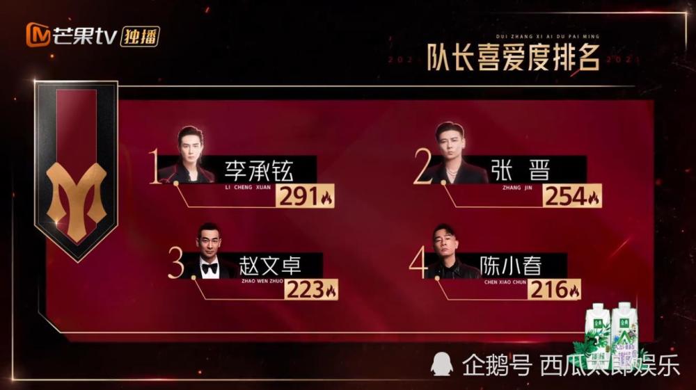 在这个基础上,节目组玩出了新的花样,把简单的一个环节变得越来越复杂,从某种层面来说,获胜的李承铉组这个环节也并非占尽优势,唯一不变的就是原有队员不用换了,而队长喜爱度排名分别是李承铉第一,张晋第二,赵文卓第三,陈小春第四
