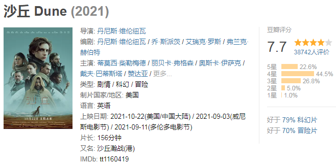 此外,《沙丘》的豆瓣评分高达7.7,67%以上的影迷给出了四五星的评价,在国内的票房也必定不会太低。