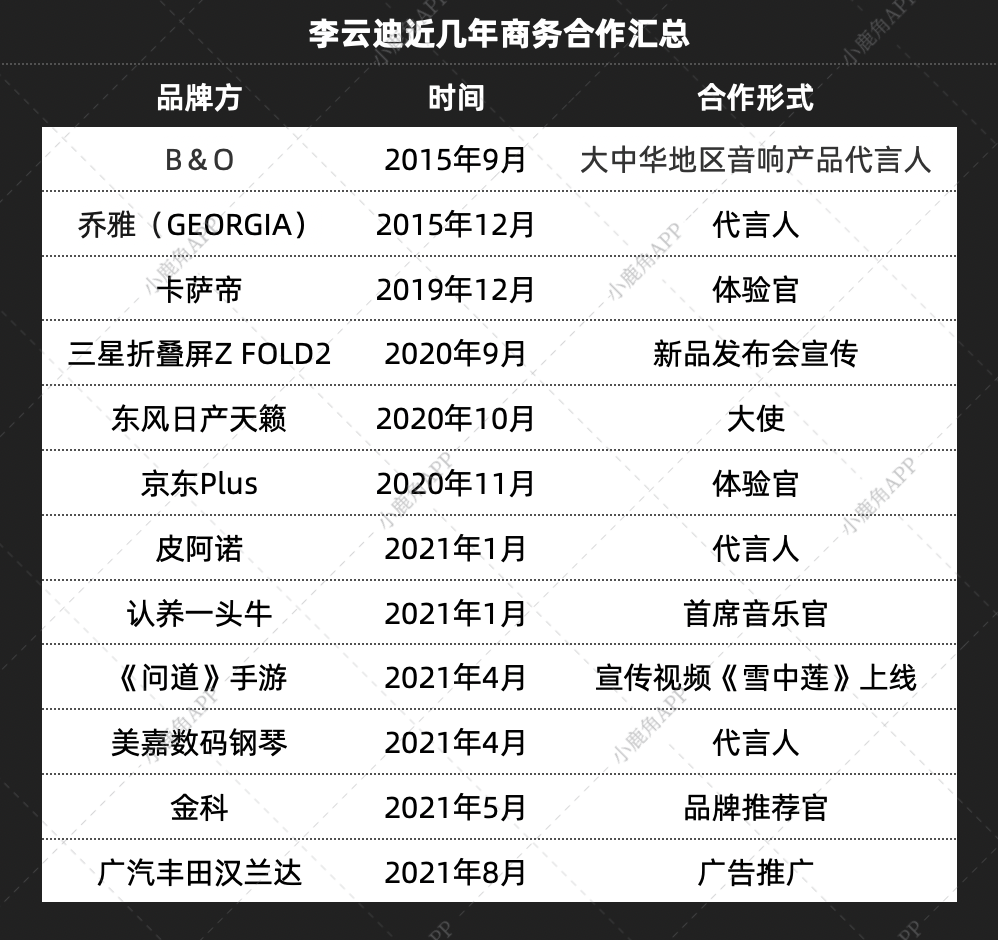 据不完全统计,李云迪从2015年至今共有12个商务合作,目前手握家居品牌皮阿诺以及美嘉数码钢琴两个代言,前者已经宣布和李云迪终止一切品牌合作关系,美嘉数码钢琴暂无表态。