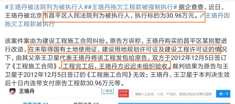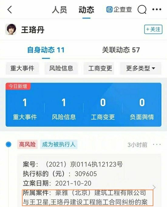 随后便出现了王珞丹被北京市昌平区法院判定为被执行人的消息,同时执行标的为309605元,从“企查查”上面可以看见王珞丹已经被列为高风险人物。消息一出,王珞丹就被置于舆论漩涡之中,一时之间,有关王珞丹及其家人人品的问题成为网友热议的话题。