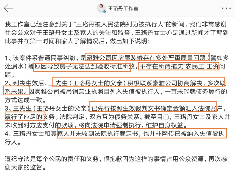22日就在王珞丹拖欠工程款的事情愈演愈烈的时候,王珞丹工作室终于出面回应了,在这篇澄清声明中,王珞丹工作室主要从四个方面进行解释。第一,网传王珞丹及其家人拖欠工资的事情,主要是因为房子到了交付的时候,没有达到验收标准,例如存在多处漏水的问题,并不是故意拖欠。第二,在判决生效之后,王珞丹的父亲就多次想要联系原告进行协商,但是苦于联系无果。事实上,在这个过程中装修公司就已经因为经营问题被列为失信执行人,从这个角度来看,原告也不一定就是没错的。